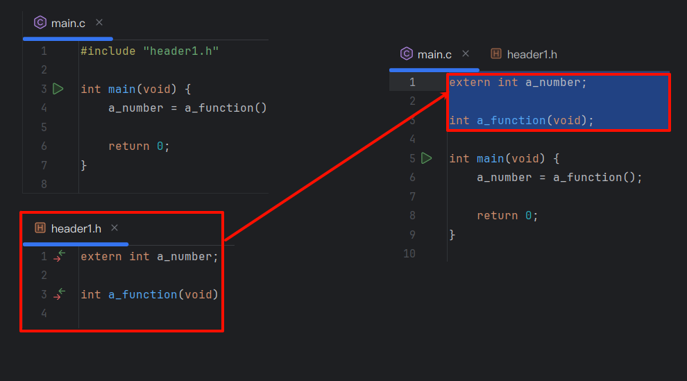 好了废话这么多,也该进入正题了。 #include 命令就是用来包含一些文件的,就是把包含文件的内容全部放到我这个文件来,这样我就可以直接用这个文件的内容了,不需要我复制粘贴一遍。理清楚这一点非常重要,编译器就是这样干的。下面用一个图简单的说一下,左边在 main.c 中包含后编译完的结果跟右边是一样的: