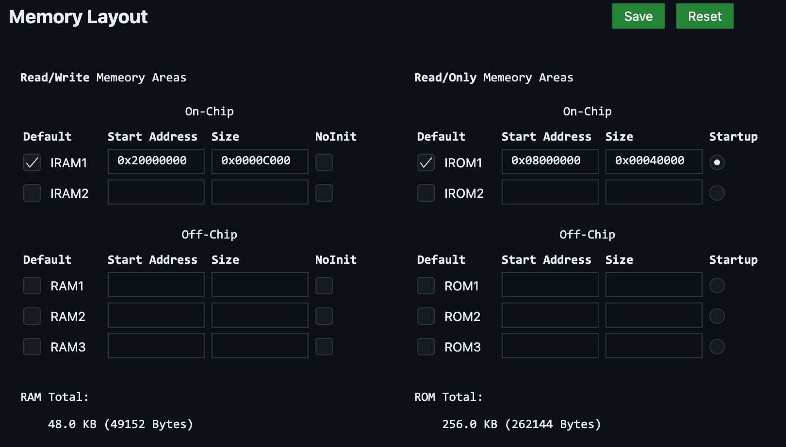 简单的内存布局不需要手动编写 sct 文件,使用 MDK, EIDE 自带的 RAM/ROM Layout 足矣。只需要设置起始地址与大小(偏移量)就可以了。